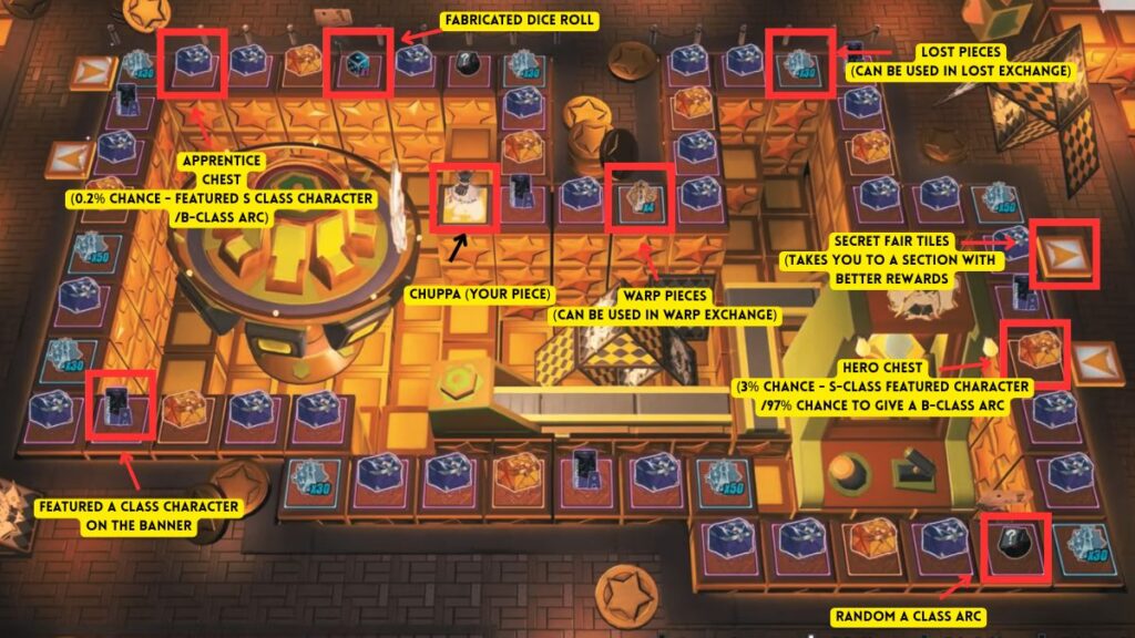 The Secret Fair is a special golden section of the board accessible through specific entry tiles. This bonus area has fewer total tiles but higher-quality rewards, including the Multiple Surprises tile (5 free dice), limited character outfit tiles, vehicle skin tiles, and S-class character tiles. Think of it as the bonus round of the gacha system.