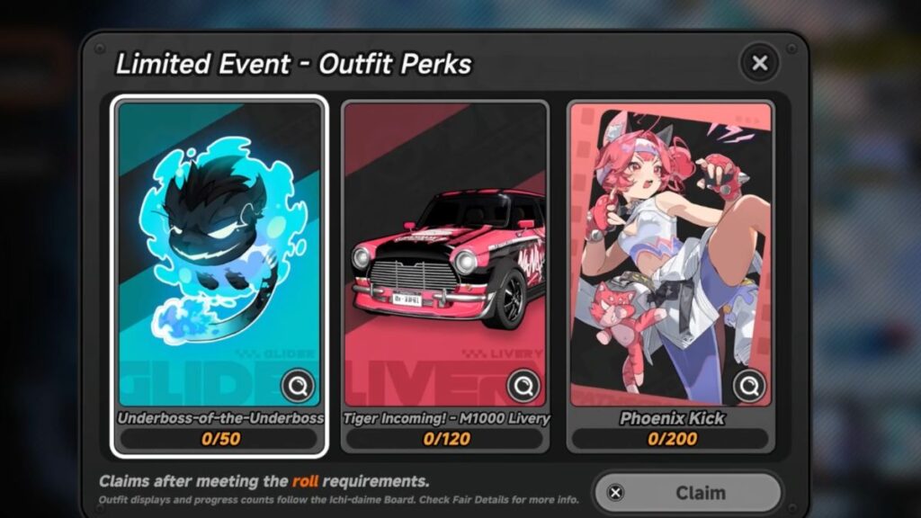 Each Limited Board features three exclusive outfit cosmetics obtainable at specific pull milestones: 50 pulls, 120 pulls, and 200 pulls. These outfits can also drop early from specific board tiles with low probability (0.33% base rate, 0.68% with pity active).